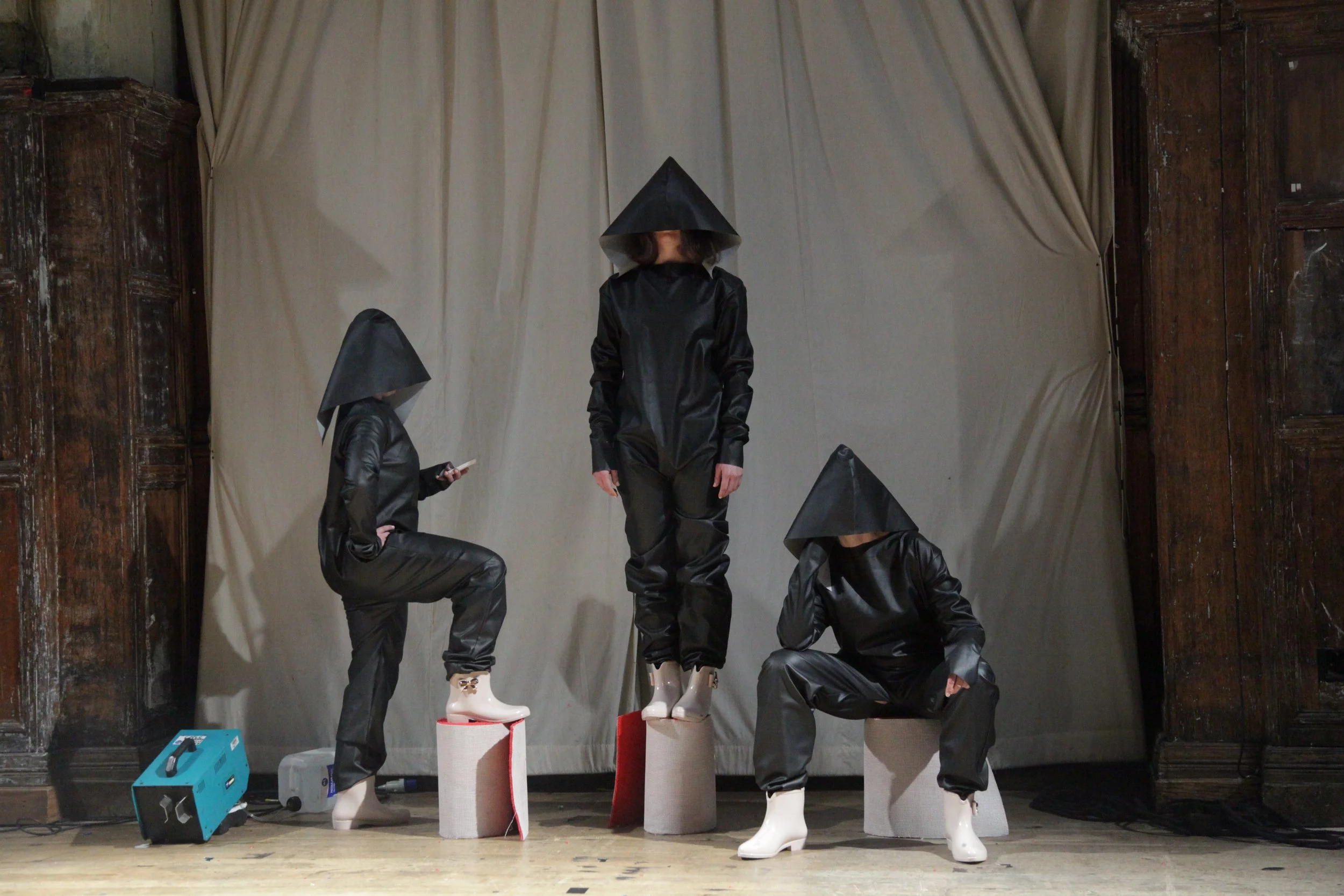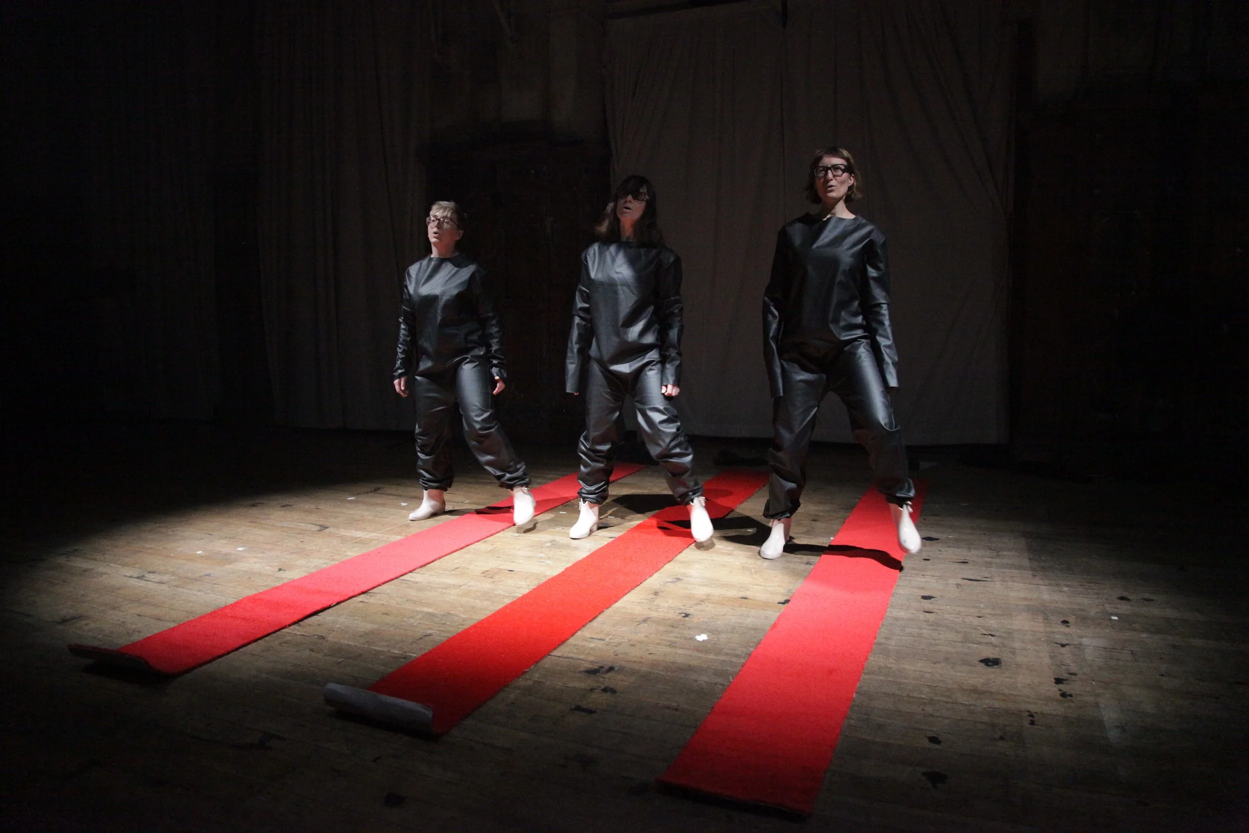 The recurring character of Heather from the film of the same name "Heathers" by Michael Lehman is embodied by us three performers at the same time and emphasized by the same clothes - black-leather work suits in one size - and the same movement sequences.